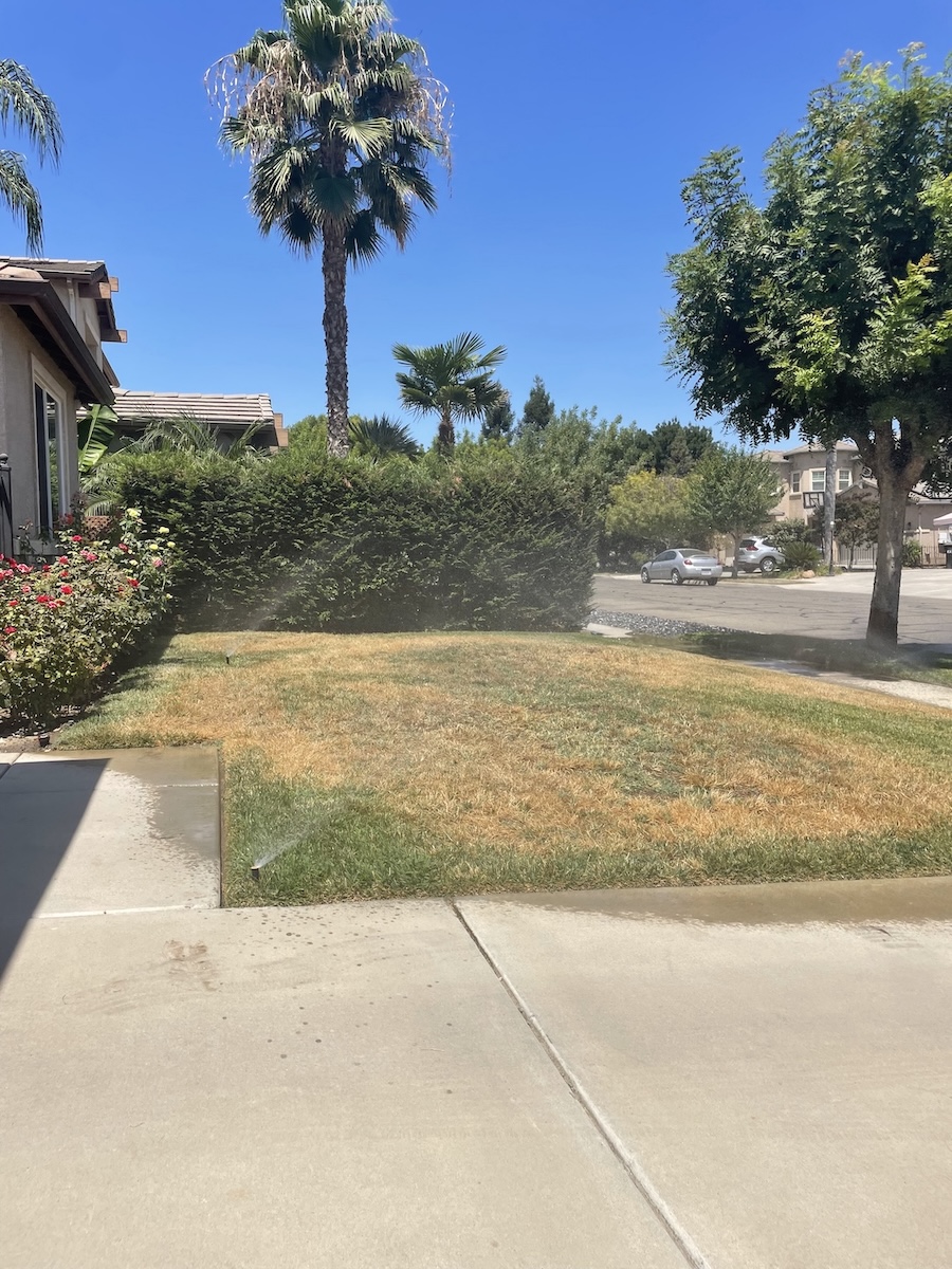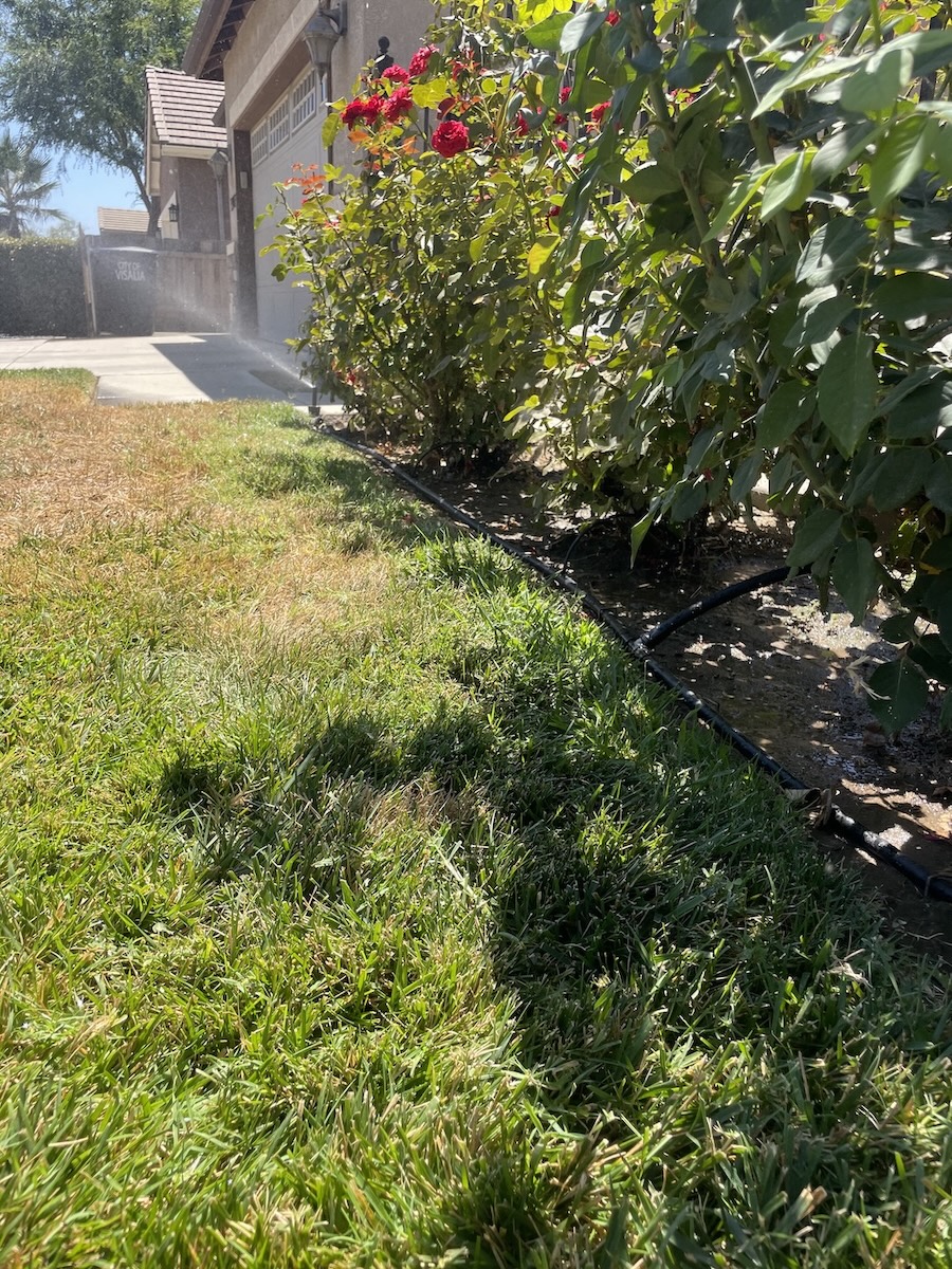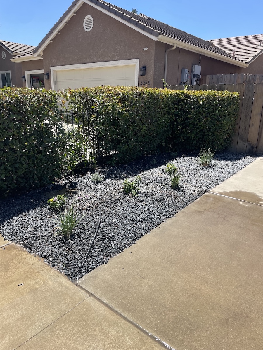 For this front yard landscaping upgrade in Visalia, California, we combined functionality with lasting curb appeal. Using a sod cutter, we removed a section of the existing lawn and prepared the space with a durable weed liner and garden bed liner. We then installed fresh granite rock and a drip irrigation system to ensure efficient watering throughout the new landscape. To bring color and life to the yard, we planted vibrant lantanas, fragrant lavender, and resilient society garlic. We also trimmed the hedge for a clean finish, replaced several sprinkler heads, and repositioned others for optimal coverage. The result is a low-maintenance, water-efficient yard with a polished, professional look that enhances this Visalia home’s overall curb appeal.